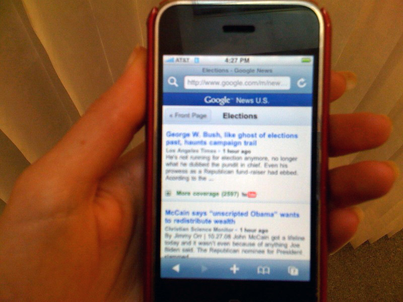 As a first step, check out two of the best mobile sites I’ve found: Google Election News Tracker and CNN’s America Votes mobile site. I have the Goog app bookmarked on my iPhone (see my strangely red hand holding up said app below), and it’s a great quick resource pulling in the latest election-related rss feeds. It’s really nothing fancier than a simple pre-loaded search query, but helpful on the go.