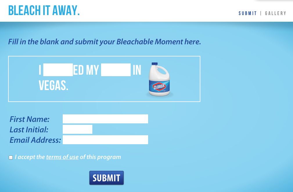 All entries are (of course) moderated and accepted entries get displayed in spots that run 15 minutes out of every hour 24/7. An email is sent to users with a link to a memento of approved “Bleachable Moments”.