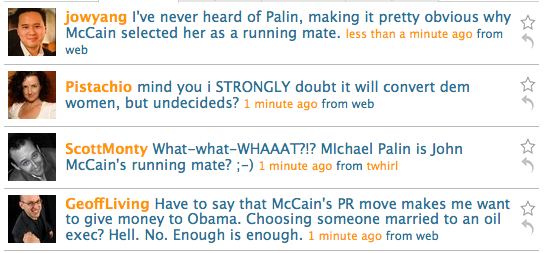 Here’s a quick Twitter screengrab I took right after the McCain announcement this morning (they were coming in hundreds per minute on my feed):
