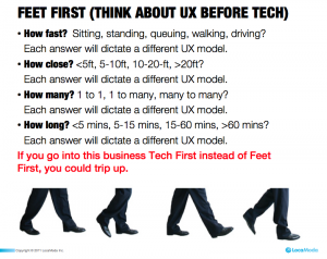 Is your user standing in line, pushing a shopping cart, carrying a bag, driving, drinking, watching a concert? How much dwell time do they have to notice, act, react, interact? In many cases, the answer is 15-60 SECONDS (see this post on how UX maps to different types of locations and engagement models).