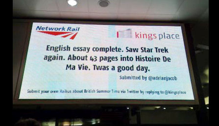Look like the social media trend is catching on in the UK! Kings Place in London has teamed up with Network Rail to host a ‘mobile poetry contest‘ using twitter and digital signage. Travelers can participate by tweeting Haiku-style poems to @kingsplace using their mobile phones. Tweets go to the largest digital screen at King’s Cross station where they’re viewed by 110,000 people every day.
