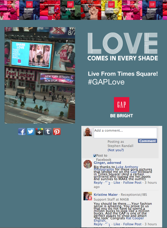 Gap has been innovating recently with their digital seasonal promotions and this holiday season is no exception. Their multi-channel holiday campaign (their third with LocaModa), “Love Comes In Every Shade” includes a 360 social/OOH program that connects out-of-home media to the most popular social networks for maximum audience amplification.