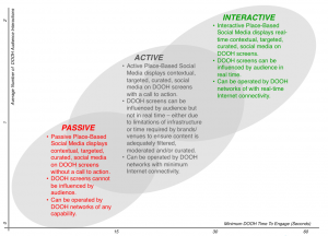 - Interactive place-based social media, with a call to action and at least 60 seconds to engage, typically has enough time for more than one DOOH user interaction and supports more complex interaction models.