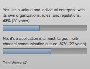 The results thus far (from a fairly limited sample set of 47 votes) favor the latter, but only marginally.