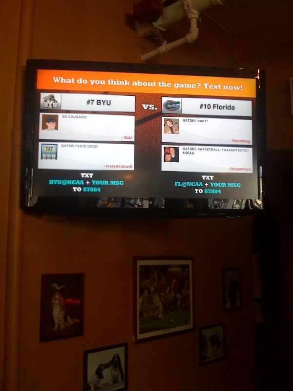 In case you didn’t get to one of the 850 bars nationwide that ran our Title Tweets campaign with AT&T and NCAA, here’s a quick content loop that shows the basic concept of the execution (though obviously no longer pulling real-time content). The DOOH version (shown here, streaming relevantly-tagged Twitter messages and txts sent directly to the screens) was also supported by an extensive online component.